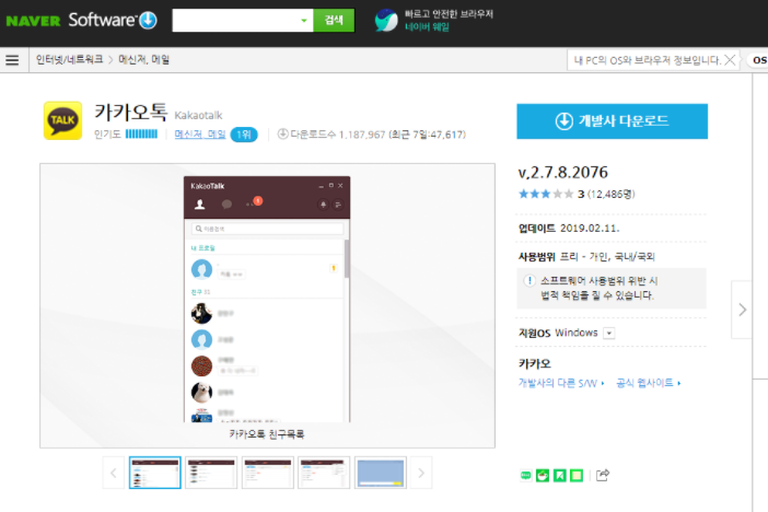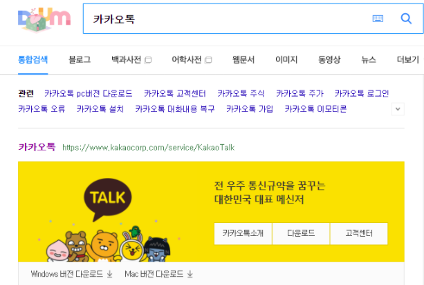 다음으로 소개해 드릴 방법은 홈페이지 접속 없이 포털 사이트에서 검색해서 다운로드 하는 방법입니다. "카카오톡"을 검색하셨을 때 홈페이지로 이동할 수 있는 링크 아래에 Windows 버전 다운로드가 있는 것을 확인하셨을 텐데요, 한번 클릭하시면 다운로드하실 수 있습니다.