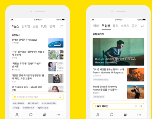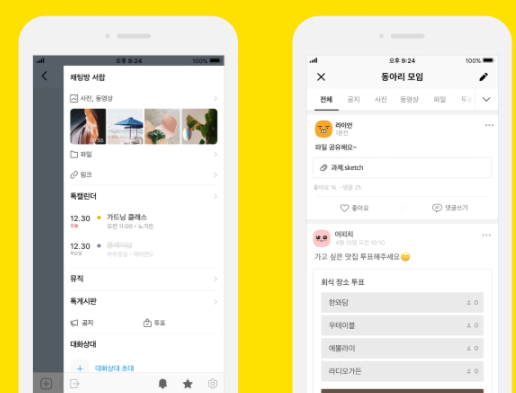 또한 톡 게시판을 이용해서 공지나 투표같은 것도 가능하며 #탭이라고 해서 주제별로 콘텐츠 검색도 가능합니다.