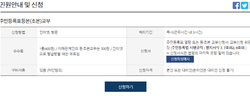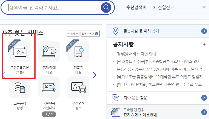 홈페이지에 접속을 하셨다면 "주민등록등본(초본)"을 클릭해서 이동해 줍니다.