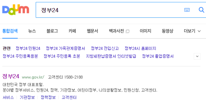 우선 인터넷을 켜 주신다음 다음이나 네이버 구글과 같은 검색 포털로 이동하신 다음 검색창에 "정부 24"를 입력하여 주시고 엔터를 눌리 주시면 아래에 홈페이지로 이동 가능한 링크가 나오게 됩니다. 링크를 눌러서 홈페이지로 이동하시면 됩니다.